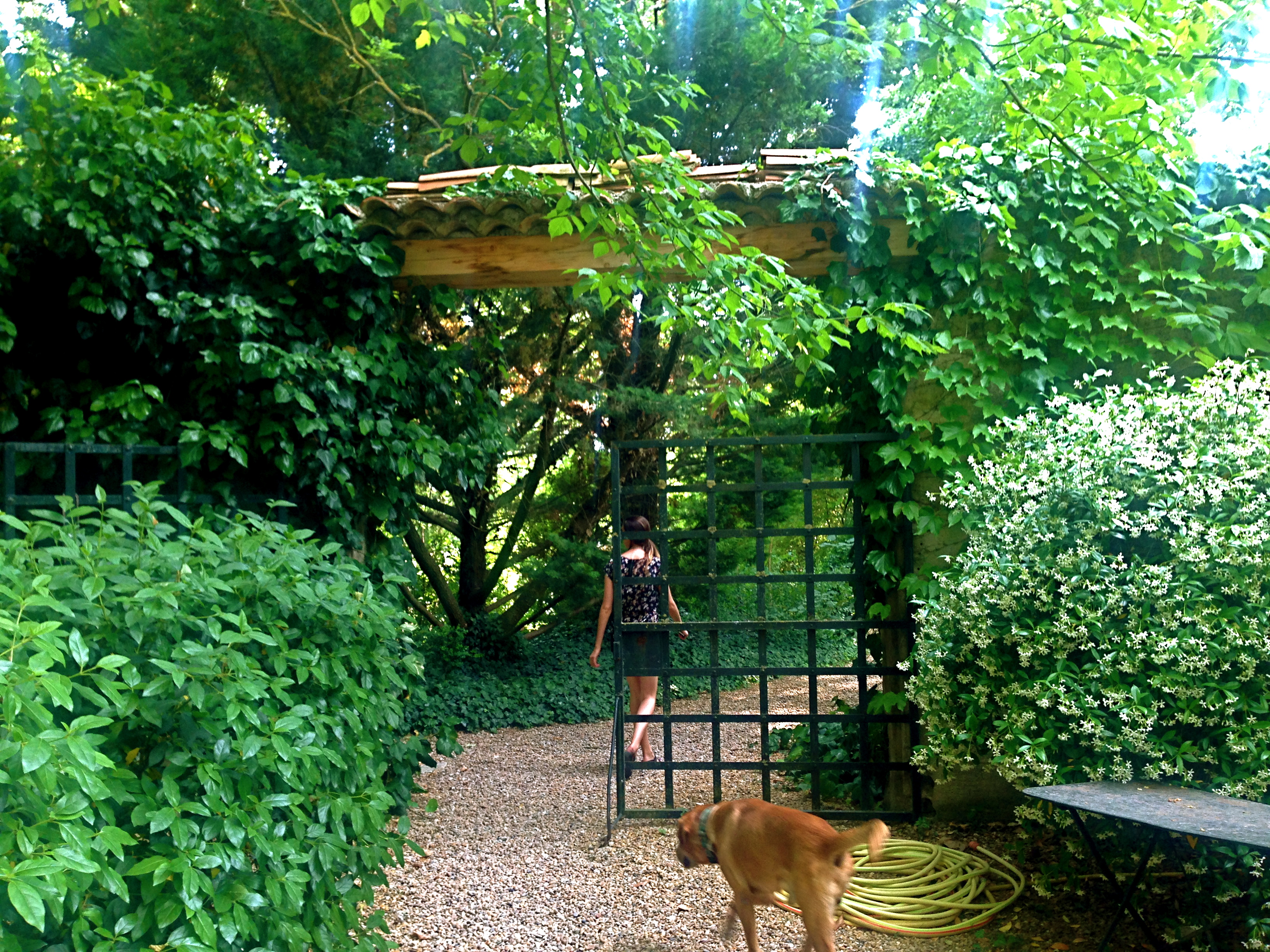 The inn we stayed in was a gorgeous manor that stretched over acres of greenery. Our room itself was enormous, with high ceilings, antique mahogany furniture, a fireplace, a claw-foot tub in the similarly enormous bathroom, and nearly floor-to-ceiling windows that looked out onto the garden below. We immediately befriended the two dogs on the property, who we took the liberty of naming Butler (pictured left following my sister), and Piggy (pictured right, just barely, waiting patiently at the inn’s kitchen entrance). Butler’s name came from the fact that he followed us around the property, seemingly to offer his services, though he ultimately proved to be unhelpful in unloading our luggage from the car. Piggy just sounded unmistakably like a little piggy.